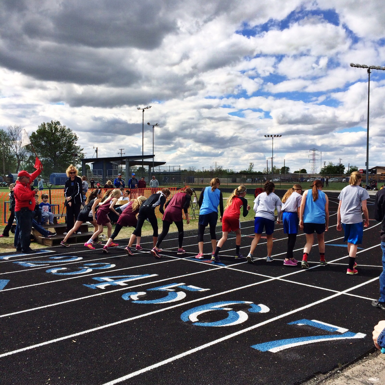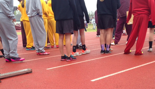 At the first meet it’s obvious that a majority of the 7th grade decided to give this opportunity a go. All shapes, all sizes and apparently major athletic prowess wasn’t a necessary requirement. Clad in everything from fancy neon track spikes to worn down basketball shoes, it seemed like this time everyone was invited to the party. God bless these coaches who had to pick and place this melting pot of hormones in events worthy of their calling.